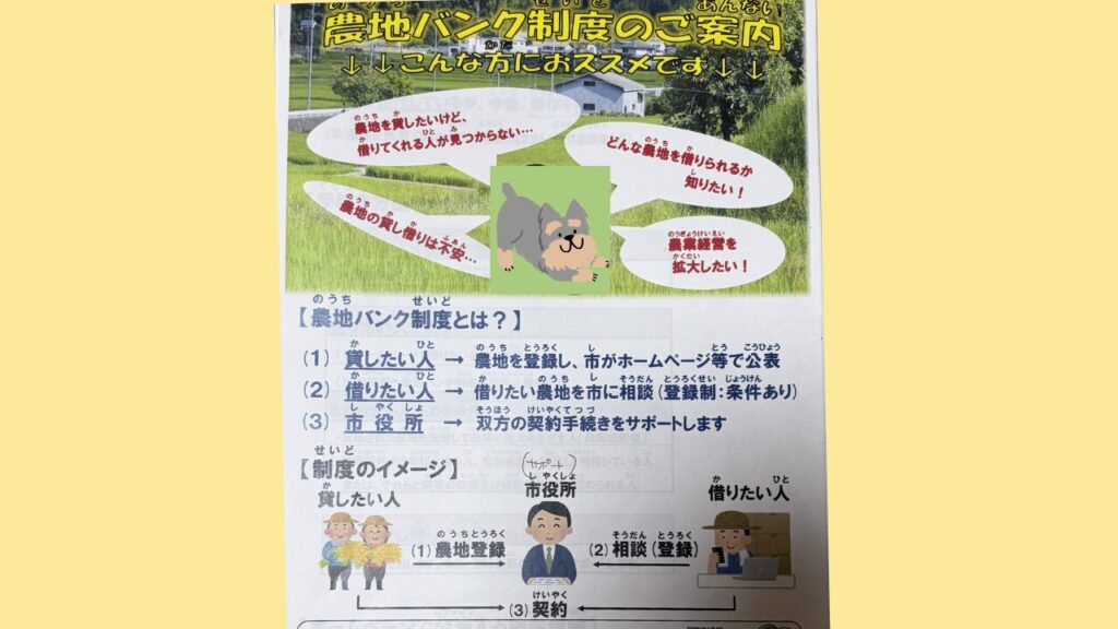 お住まいの行政機関(市役所など)に問い合わせると田んぼや畑を所有していても自分たちで使わないところを市と提携して貸し出す制度を設けている場合があります。